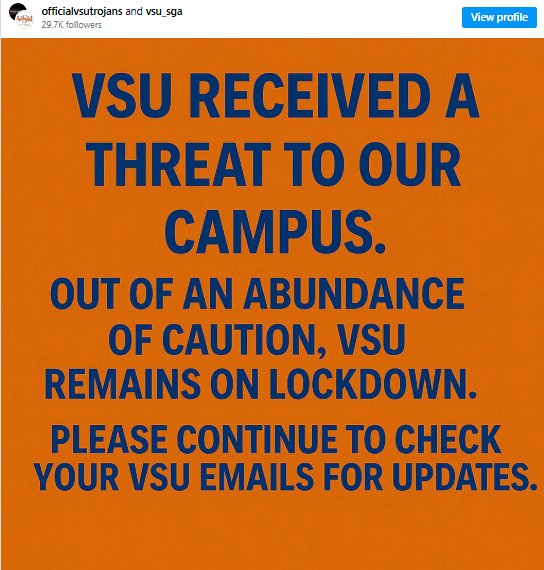 Students were told to stay indoors and monitor VSU emails for updates. Those off-campus students were urged not to return until further notice.
