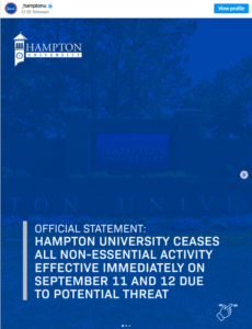 Hampton University announced the cancellation of all non-essential activities, including classes and campus events, for Thursday, September 11, and Friday, September 12.