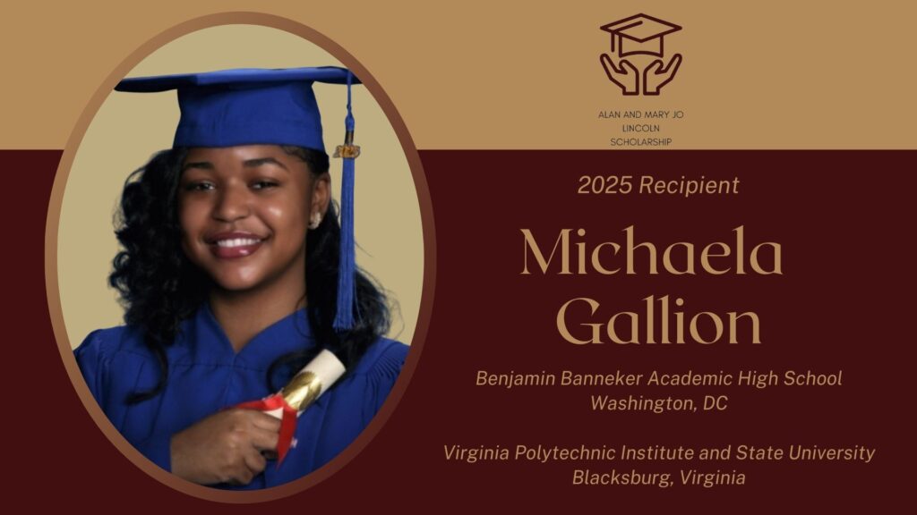 The Alan and Mary Jo Lincoln Scholarship (AMJL) Program, presented by Riverside Sales Group, LLC, awarded its 2025 scholarship to Ms. Michaela Gallion. Ms. Gallion graduated in June 2025 with a 4.35 GPA from Benjamin Banneker Academic High School in Washington D.C., and recently started her freshman year at Virginia Tech in Blacksburg, Virginia. She received an award of $1,000 to support her studies.