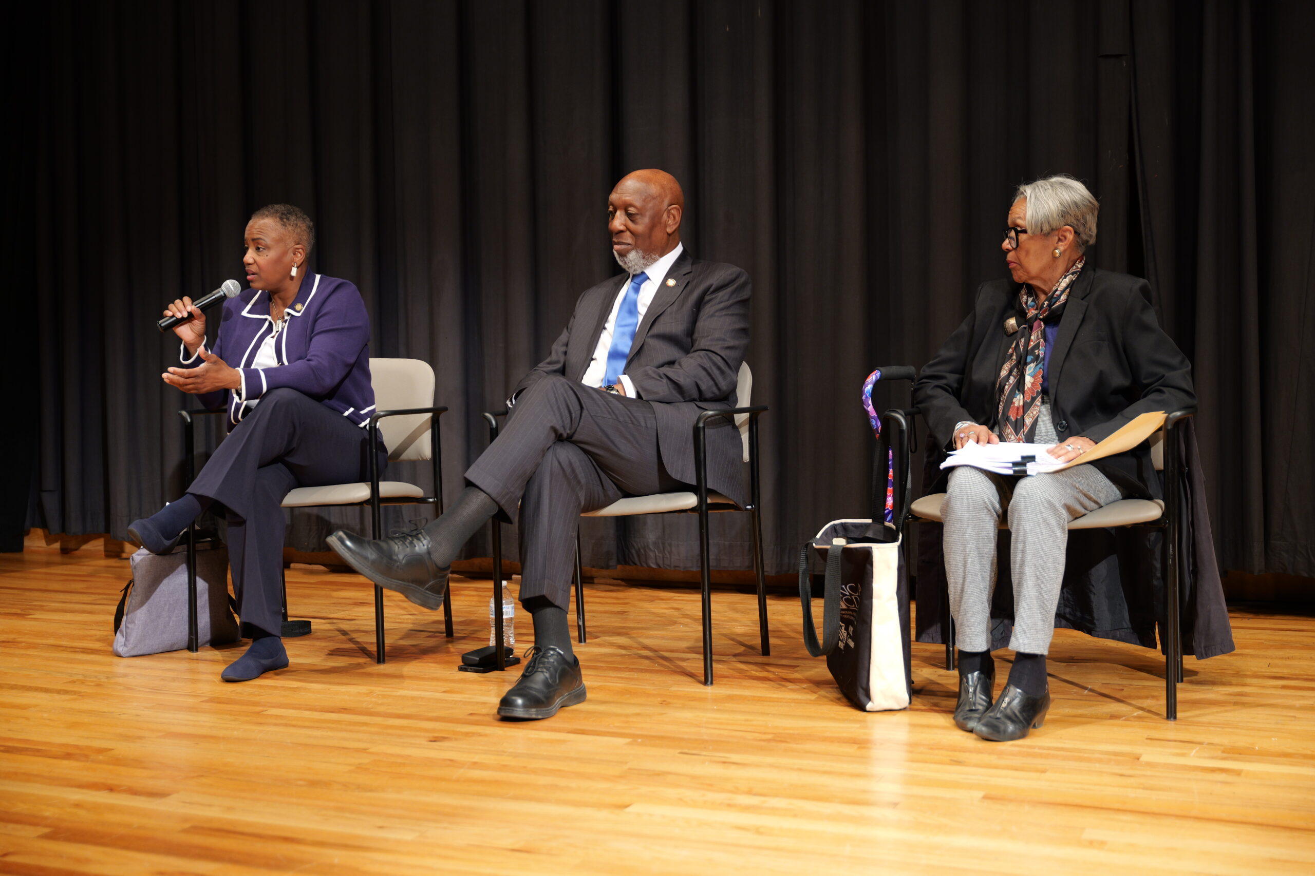 North Carolina Sen. Kandie Smith, left, state Rep. Shelly Willingham, center, and Susan Perry Cole, president and CEO of the North Carolina Association of Community Development Corporations, participated in a town hall at Edgecombe Community College in Tarboro, N.C., on Oct. 23, 2025.